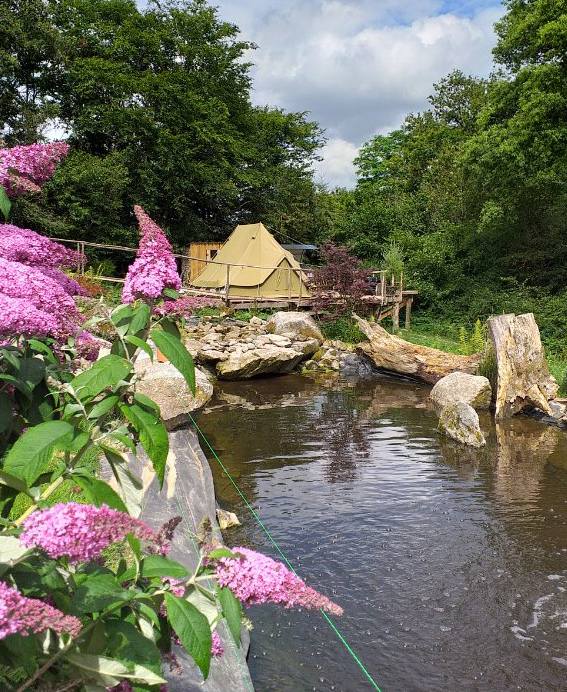 Glamping dans le Morvan : une grande tente luxueuse aménagée avec lit double, salon, cuisine, terrasse, spa... tout le confort pour passer un super moment sous les étoiles !